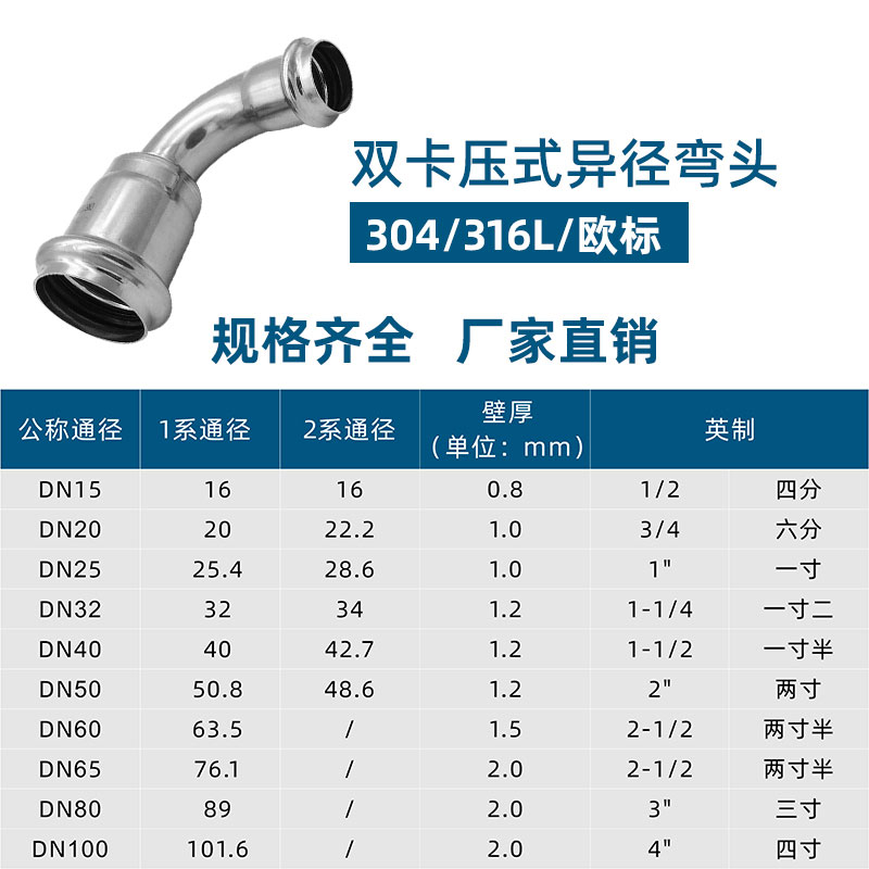 不銹鋼水管雙卡壓管件,不銹鋼水管雙卡壓式異徑彎頭,304 316L不銹鋼材質,堅固耐用,光滑內壁,不易生銹,耐腐防漏。